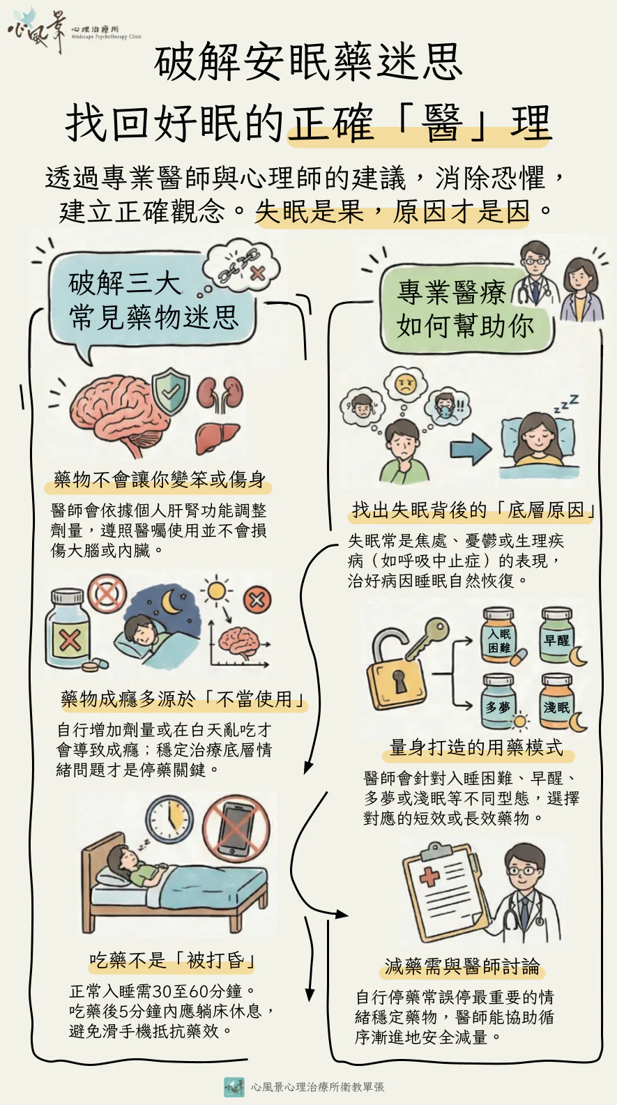 心風景心理治療所特別製作了《破解安眠藥迷思:找回好眠的正確醫理》圖卡。我們想告訴您:失眠往往是心靈發出的「求救訊號」,藥物是幫手,而非唯一的依賴。